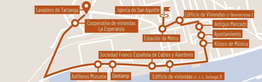 En frente de este edificio podemos ver las instalaciones de la empresa Astilleros de Murueta, nacida en 1943. Una importante empresa naval altamente especializada que cuenta con gran grada de 156 metros de largo. Las grúas de tipo pelícano destacan en el cielo del municipio, siendo hoy el emblema de la larga tradición naval de la zona. Unos metros más adelante nos encontramos con la Sociedad Franco Española de Trefilería, Cablería y Tranvías Aéreos, constituida en 1900 de la mano de los franceses Senret y Chandonet, cuyo edificio fue diseñado por el ingeniero francés Filiberto Bonvillain. La empresa nació con el fin de hacer cable de acero para la minería, puentes y otras industrias y, poco a poco, se convirtió en una de las líderes de su sector. Levantada en un terreno de 8.000 m2, propiedad de la familia Jado, su actual aspecto es fruto de las reformas de carácter racionalista llevadas a cabo entre 1939 y 1967 por Manuel y Carlos Castellanos.